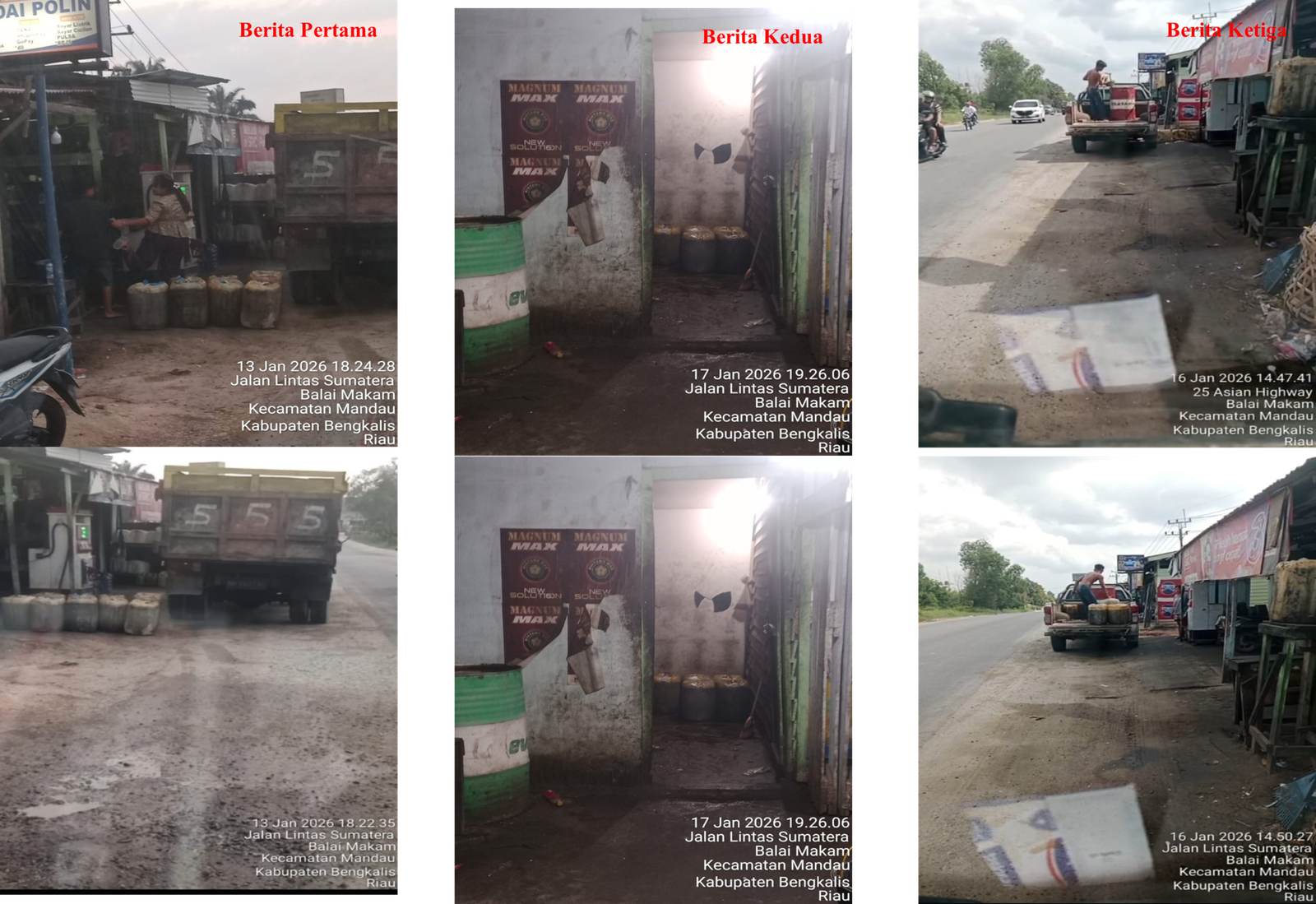 16 Januari 2026: Aktivitas tersebut masih berlanjut secara terang-terangan, bahkan terekam mobil bak terbuka (Pick-Up) melakukan bongkar muat jeriken di siang bolong tepat di pinggir jalan lintas utama.