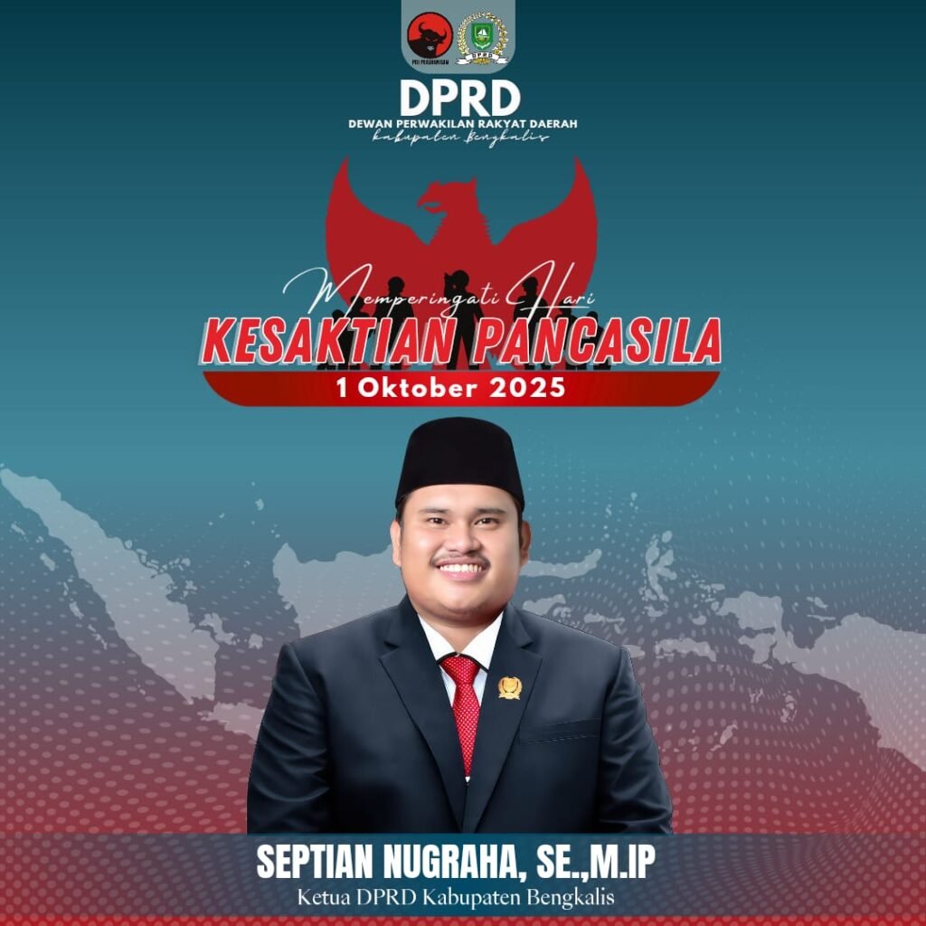 Ketua DPRD Kabupaten Bengkalis, Septian Nugraha, SE., M.IP, atas nama Pimpinan dan Anggota DPRD Kabupaten Bengkalis mengucapkan Selamat Hari Kesaktian Pancasila, ia mengajak seluruh elemen masyarakat untuk menjadikan momentum ini sebagai sarana memperkokoh persatuan, menjaga persaudaraan, dan meneguhkan komitmen kebangsaan, Rabu (01/10/2025).