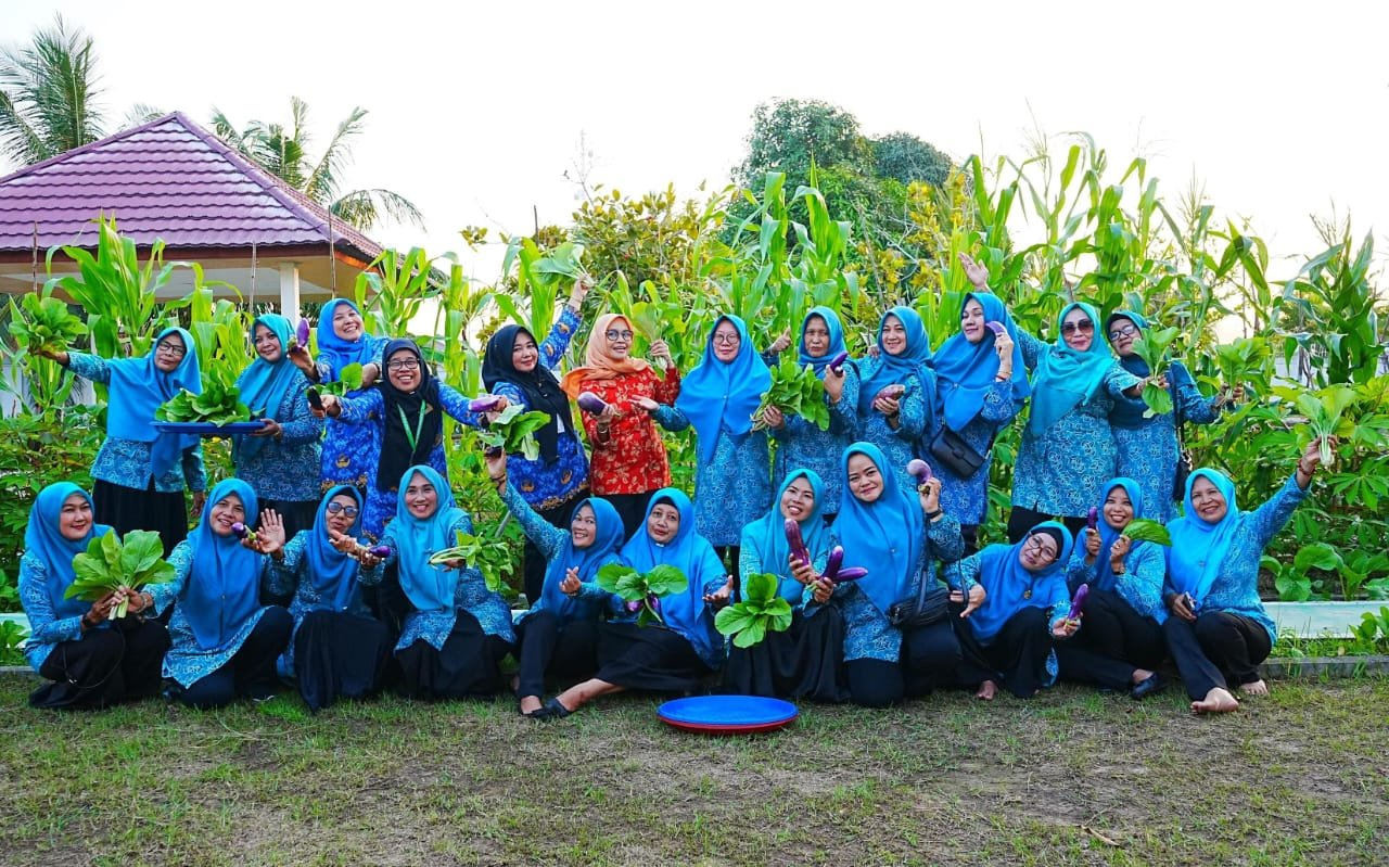 Dalam kesempatan tersebut, Hj. Siti Aisyah bersama Ketua DWP Ira Vandriyani dan pengurus PKK Kabupaten Bengkalis turut melakukan panen berbagai jenis sayuran hasil budidaya seperti sawi, terong, dan cabai.